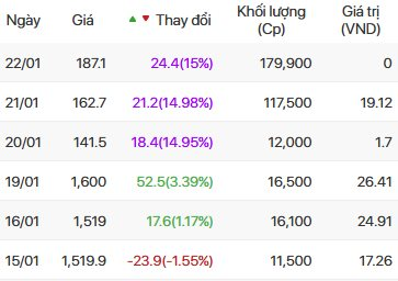 Cụ thể, khối lượng khớp lệnh trong phiên 22/01 đạt xấp xỉ 180.000 đơn vị, gấp gần 20 lần so với mức trung bình chỉ khoảng 9.000 cổ phiếu của những phiên giao dịch đầu tháng 1.