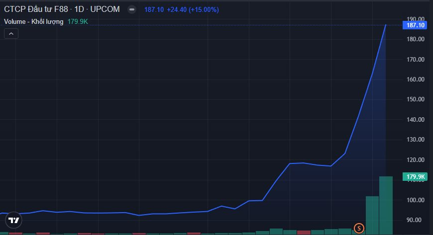 Kết thúc phiên giao dịch ngày 22/01, cổ phiếu F88 đóng cửa trong sắc tím tại mức giá 187.100 đồng/cổ phiếu, tăng 15% so với tham chiếu. Đây là phiên tăng trần thứ 3 liên tiếp của mã này kể từ khi giá tham chiếu được điều chỉnh kỹ thuật vào ngày 20/01.