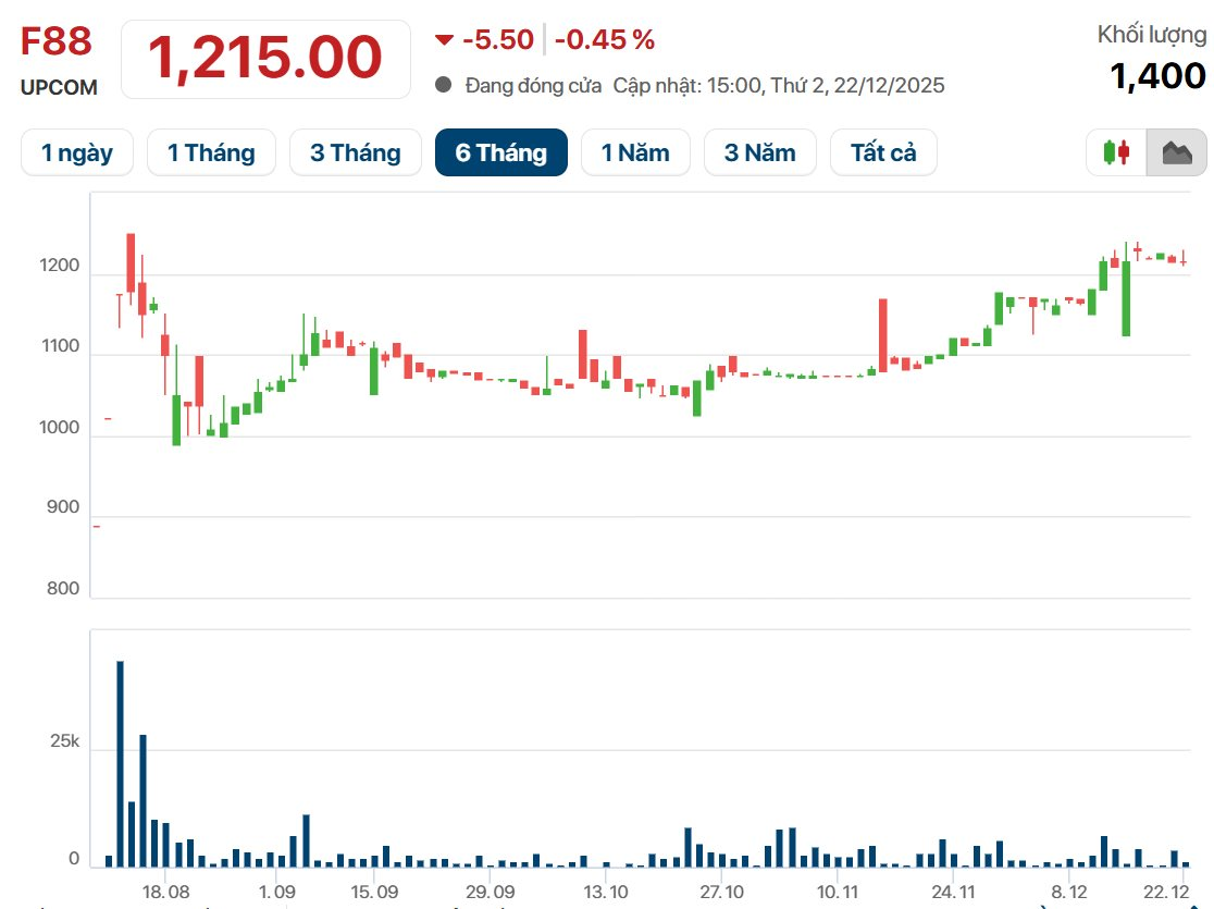 Kết thúc phiên giao dịch ngày 22/12, cổ phiếu F88 đóng cửa tại mức giá 1.215.000 đồng/cp.