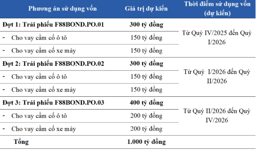 Nguồn lực tài chính thu về từ đợt phát hành này sẽ được dùng để F88 mở rộng mạng lưới kinh doanh, phục vụ nhu cầu vay vốn đang tăng trưởng trở lại của phân khúc khách hàng phổ thông.