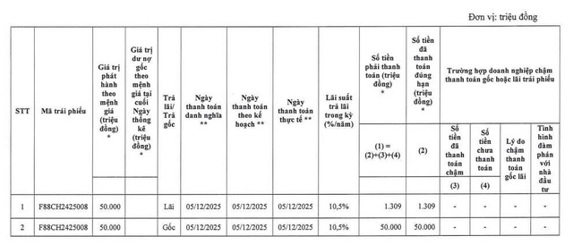 Cùng chiều diễn biến, trước đó ngày ngày 21/11/2025, F88 cũng đã thực hiện thanh toán đúng hạn 100 tỷ đồng tiền gốc và hơn 2,6 tỷ đồng tiền lãi cho lô trái phiếu mã F88CH2425007.