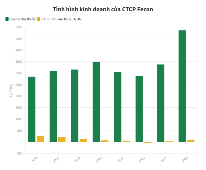Năm 2025, FECON ghi nhận doanh thu gần 4.862 tỷ đồng, tăng 44%, lợi nhuận sau thuế hơn 96 tỷ đồng, song áp lực chi phí tài chính và dòng tiền vẫn lớn.