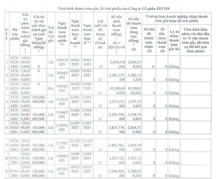 Trong năm 2025, Fecon đã chi tổng cộng hơn 119 tỷ đồng để thực hiện thanh toán gốc, lãi cho các lô trái phiếu mã FCNH2325001, FCNH2426001 và FCN12501.