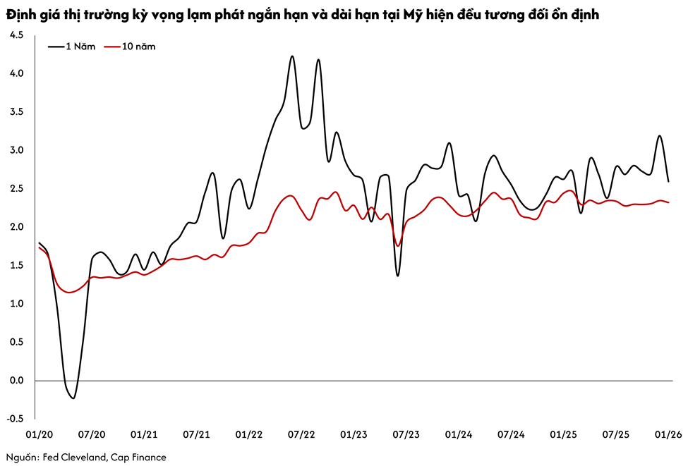Mặt khác, với việc bổ nhiệm Chủ tịch mới, ghế Thống đốc của Stephen Miran và khả năng một ghế Thống đốc khác để thay thế Lisa Cook, phe của Tổng thống Trump khó có thể buộc Fed cắt giảm lãi suất mạnh tay trong năm nay (nói vậy không phải là Fed không cắt giảm lãi suất, mà chỉ là sẽ không mạnh tay). Kỳ vọng lạm phát trong cả ngắn hạn và dài hạn đều tương đối ổn định, cho thấy thị trường không quá lo ngại về vấn đề độc lập của Fed.