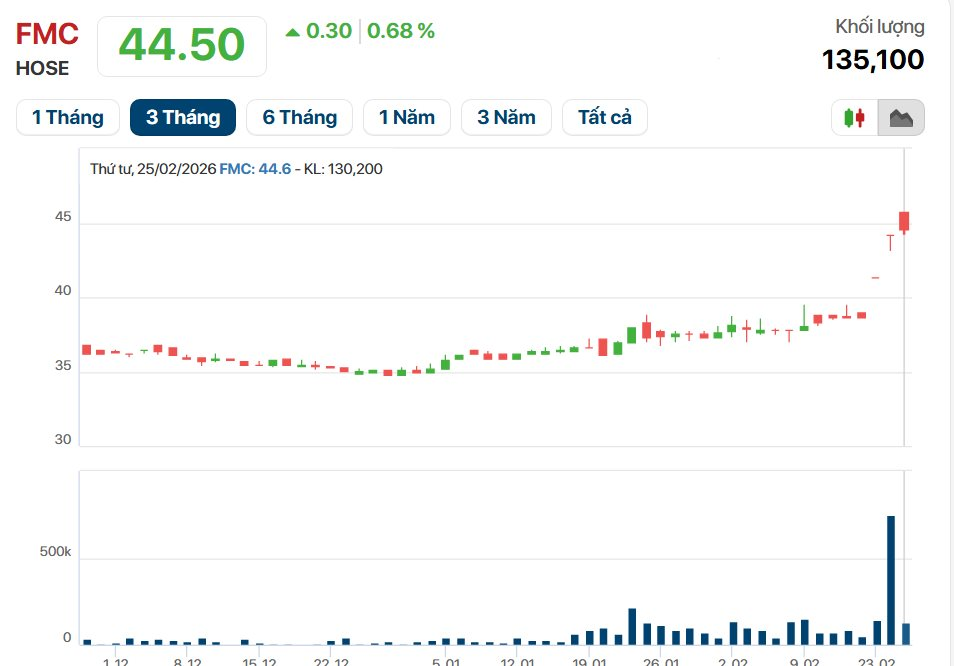Sự thay đổi nhân sự cấp cao diễn ra trong bối cảnh thị giá cổ phiếu FMC ghi nhận diễn biến giao dịch tích cực. Sau hai phiên tăng kịch trần liên tiếp vào ngày 23/2 và 24/2, mã FMC tiếp tục nhích lên trong phiên sáng ngày 25/2. Thị giá giao dịch ổn định quanh mức 44.500 đồng/cổ phiếu, cùng khối lượng khớp lệnh đạt 132.200 đơn vị, đưa quy mô vốn hóa thị trường vượt mức 2.900 tỷ đồng.