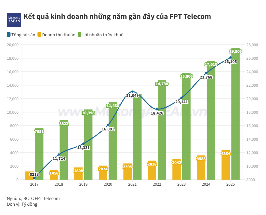 Luỹ kế cả năm 2025, FPT Telecom ghi nhận doanh thu thuần 19.506,7 tỷ đồng, tăng 10,8% so với năm 2024. Lợi nhuận trước thuế lên mức cao nhất lịch sử hoạt động, đạt hơn 4.363,9 tỷ đồng, tăng 21,6% YoY.