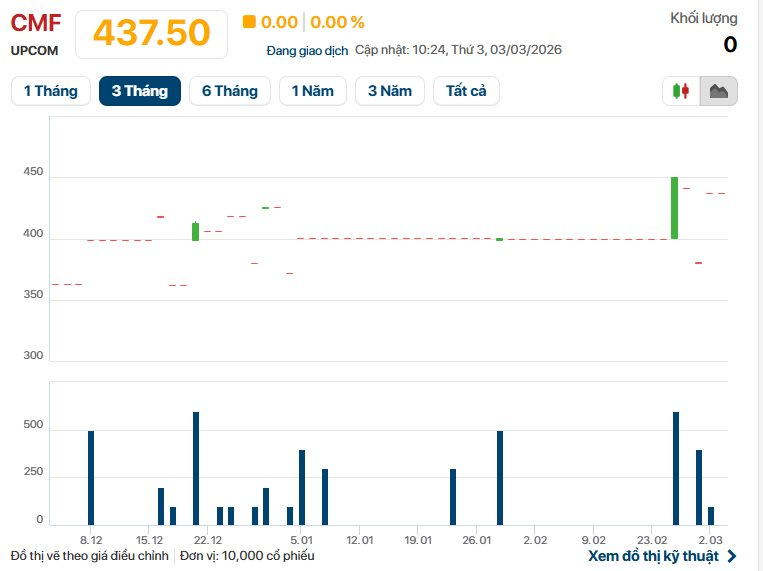Trên thị trường chứng khoán, cổ phiếu CMF của Cholimex Food giao dịch quanh mức gần 437.500 đồng/cp, thuộc nhóm giá cao trên sàn. Giá trị vốn hoá thị trường ở mức 3.500 tỷ đồng.