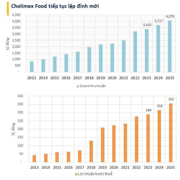Theo Báo cáo tài chính năm 2025, Công ty cổ phần Thực phẩm Cholimex (Cholimex Food, mã CK: CMF) ghi nhận kết quả kinh doanh tích cực với doanh thu hợp nhất đạt khoảng 4.075 tỷ đồng, tăng gần 9% so với năm trước.
