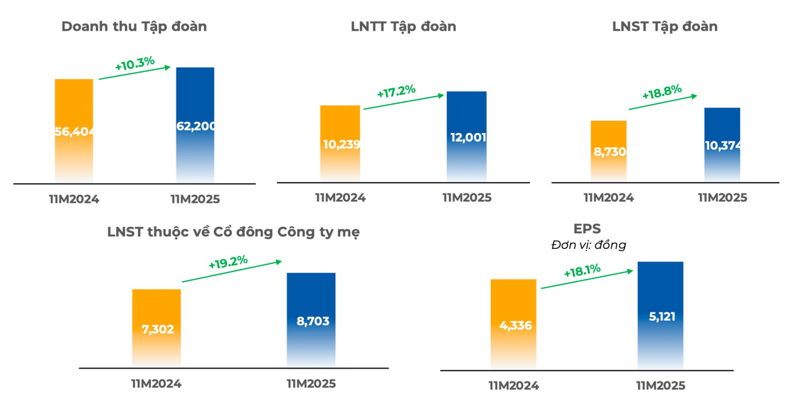 Trong mảng giáo dục, đầu tư và khác, doanh thu tăng trưởng nhẹ 3,2% lên 5.712 tỷ đồng trong 11 tháng đầu năm 2025, LNTT ghi nhận 2.614 tỷ đồng, tăng trưởng gần 25% so với cùng kỳ.