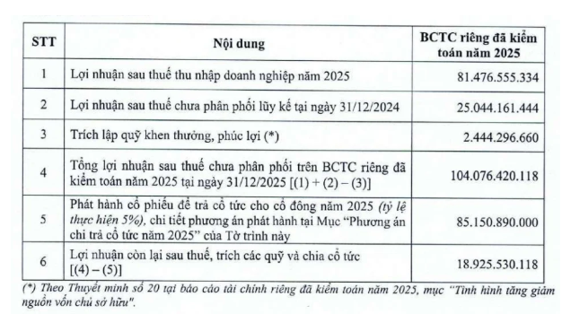 Trong năm 2025, công ty mẹ chỉ lãi 81,4 tỷ đồng, giảm mạnh so với con số 168,5 tỷ đồng của năm 2024. Hơn nữa, với việc chia cổ tức cổ phiếu tỷ lệ 24% cho năm 2024 thì tại 31/12/2025 lợi nhuận sau thuế chưa phân phối của công ty mẹ chỉ còn lại 104 tỷ đồng. Sau khi thực hiện chia cổ tức cổ phiếu tỷ lệ 5% cho năm 2025 thì dự kiến còn lại chưa đến 19 tỷ đồng.
