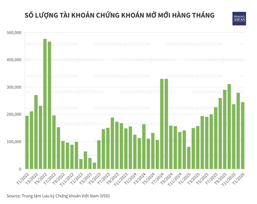 Theo số liệu từ Tổng công ty Lưu ký và Bù trừ Chứng khoán Việt Nam (VSD), trong tháng 1/2026, thị trường chứng khoán ghi nhận thêm hơn 244.700 tài khoản giao dịch mới. Trong đó, nhà đầu tư cá nhân trong nước mở mới gần 244.300 tài khoản trong tháng; nhóm tổ chức trong nước mở mới thêm 87 tài khoản.