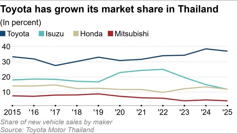 Các nhà sản xuất ô tô Trung Quốc coi con đường thành công của Toyota tại Thái Lan là một câu chuyện thành công chưa từng có. Kể từ năm 2023, khi các nhà sản xuất ô tô Trung Quốc tăng cường gia nhập thị trường, các nhà sản xuất ô tô Nhật Bản - trước đây nắm giữ gần 90% doanh số bán xe mới tại Thái Lan - đã chứng kiến thị phần của họ giảm xuống còn 69,3% trong cả năm 2025, theo dữ liệu bán hàng do Toyota Thái Lan tổng hợp.