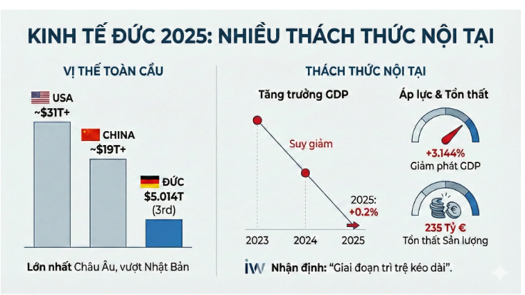 Số liệu sơ bộ cho thấy, GDP Đức chỉ tăng 0,2% trong năm 2025, sau hai năm liên tiếp suy giảm. Theo đánh giá của các nhà kinh tế, mức tăng khiêm tốn này chưa đủ để tạo ra bước ngoặt đáng kể. Viện Kinh tế Đức (IW) cảnh báo nền kinh tế lớn nhất châu Âu đang bước vào “một giai đoạn trì trệ kéo dài”, với tổn thất sản lượng riêng trong năm 2025 ước tính lên tới 235 tỷ euro.
