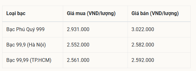 - Bạc 99,9: Thu mua ở mức 2.552.000 đồng/lượng và bán ra khoảng 2.582.000 đồng/lượng.