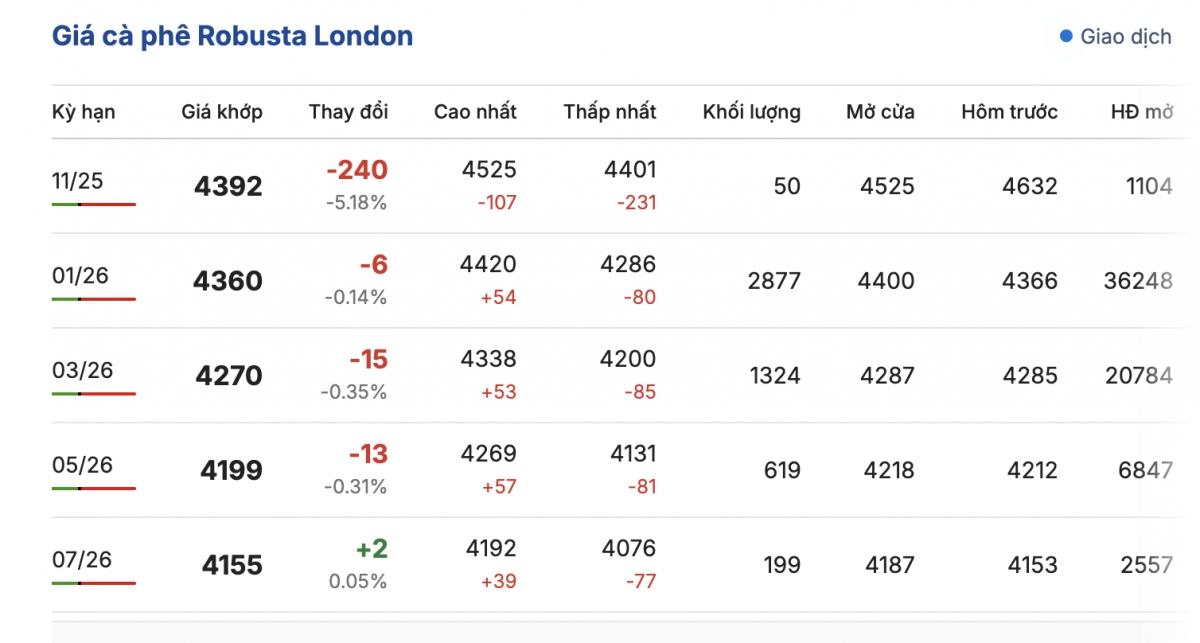 Giá cà phê thế giới sáng nay (thứ Sáu 14/11 - theo giờ Việt Nam) trên 2 sàn giao dịch quốc tế cùng giảm. Cụ thể, giá cà phê Robusta hợp đồng kỳ hạn giao tháng 9/2025 trên sàn London giảm 5,18%, tương đương giảm 240 USD/tấn so với phiên trước, giá bán đang là 4.392 USD/tấn.