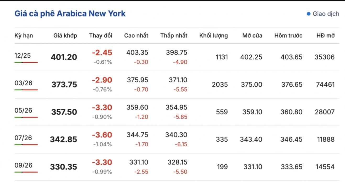 Cùng thời điểm này, giá cà phê Arabica trên sàn New York kỳ hạn hợp đồng giao tháng 9/2025 giảm 0,76%, tương đương giảm 3,05 cent/lb so với chốt phiên liền trước, giá bán đang là 401.20 cent/lb.