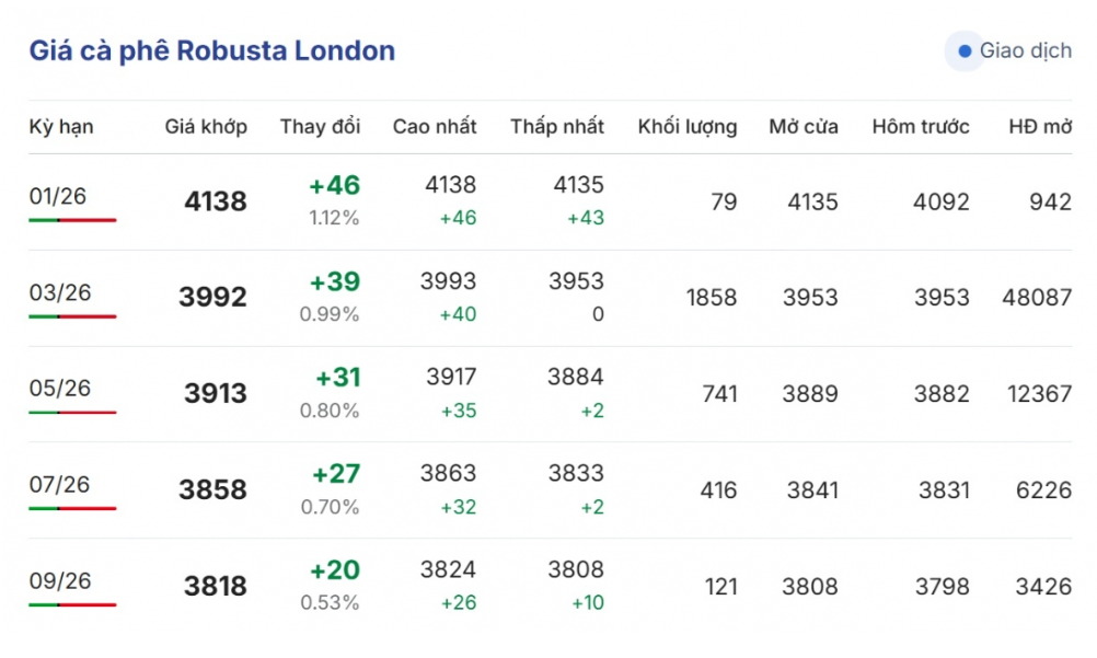 Giá cà phê thế giới vào lúc 21h00 tối nay (14/1 - theo giờ Việt Nam) tiếp diễn trạng thái tăng trên 2 sàn giao dịch quốc tế. Cụ thể, giá cà phê Robusta hợp đồng kỳ hạn giao tháng 1/2026 trên sàn London tăng 1,12%, tương đương tăng 46 USD/tấn, giá giao dịch đang là 4.138 USD/tấn.