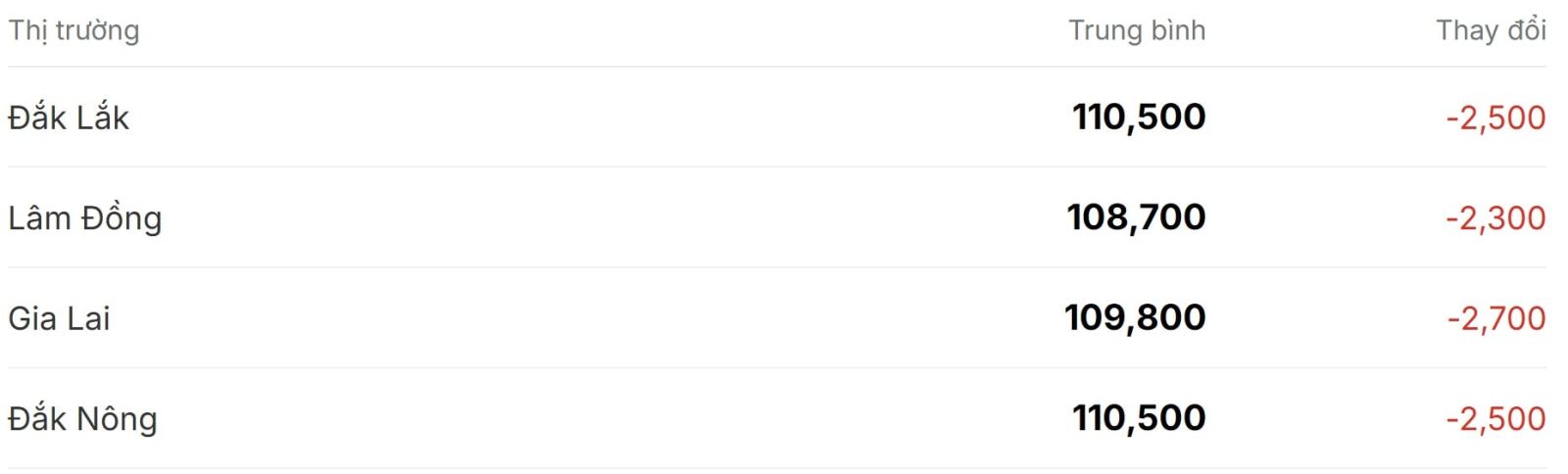 Cụ thể, tại Đắk Nông (cũ) giá cà phê giảm 2.500 đồng/kg, hiện đang thu mua ở mức 110.500 đồng/kg. Giá cà phê tại Đắk Lắk cũng giảm về mức giá 110.500 đồng/kg, giảm 2.500 đồng/kg.