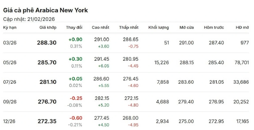 Cùng thời điểm, giá cà phê Arabica trên sàn New York kỳ hạn giao tháng 3/202 đạt mức 288,30 US cent/lb.