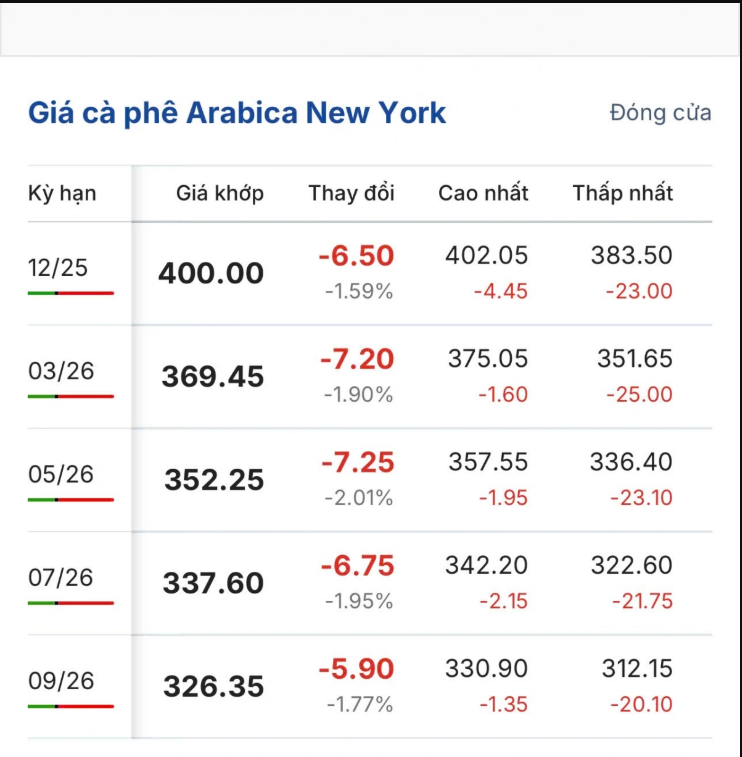 Trong khi đó, giá cà phê Arabica trên sàn New York kỳ hạn giao tháng 12/2025 là 400 US cent/lb, đi ngang so với phiên liền trước.