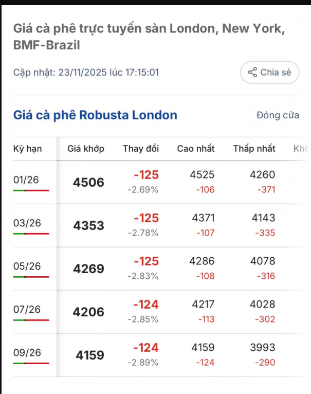 Trên thị trường thế giới chiều 23/11 (theo giờ Việt Nam) giá cà phê trên 2 sàn quốc tế đi ngang. Cụ thể, giá cà phê Robusta hợp đồng kỳ hạn giao tháng 1/2026 trên sàn London ổn định, giao dịch ở mức 4.506 USD/tấn.
