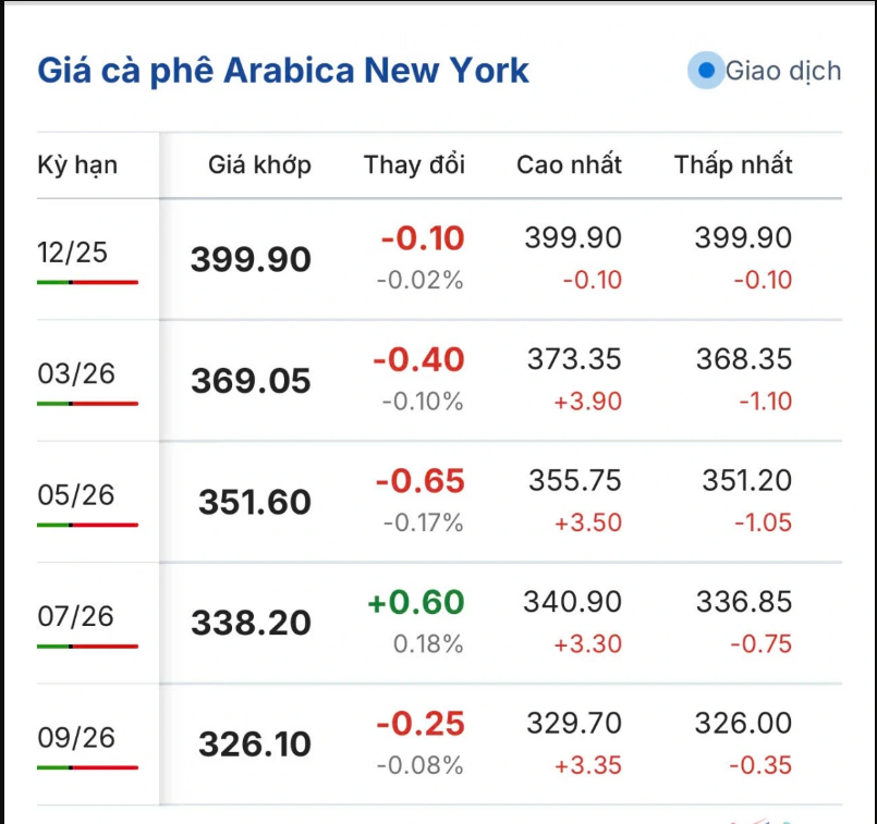 Trong khi đó, giá cà phê Arabica trên sàn New York kỳ hạn giao tháng 12/2025 giảm 0,02%, tương ứng giảm 0.10 cent/lb, giao dịch ở mức 399.90 cent/lb.