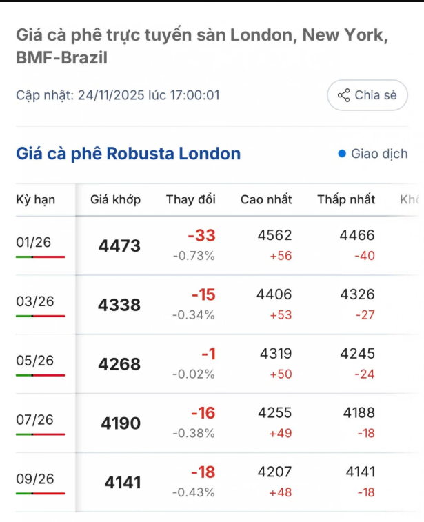 Trên thị trường thế giới chiều 24/11 (theo giờ Việt Nam) giá cà phê trên 2 sàn quốc tế đều giảm. Cụ thể, giá cà phê Robusta hợp đồng kỳ hạn giao tháng 1/2026 trên sàn London giảm 0,73% tương ứng giảm 33 USD/tấn, giao dịch ở mức 4.473 USD/tấn.