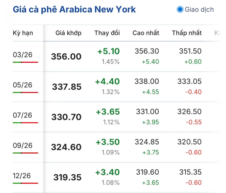 Trong khi đó, trên sàn New York, giá cà phê Arabica giao tháng 3/2026 tăng 1,45%, giao dịch ở mức 356 US cent/lb.