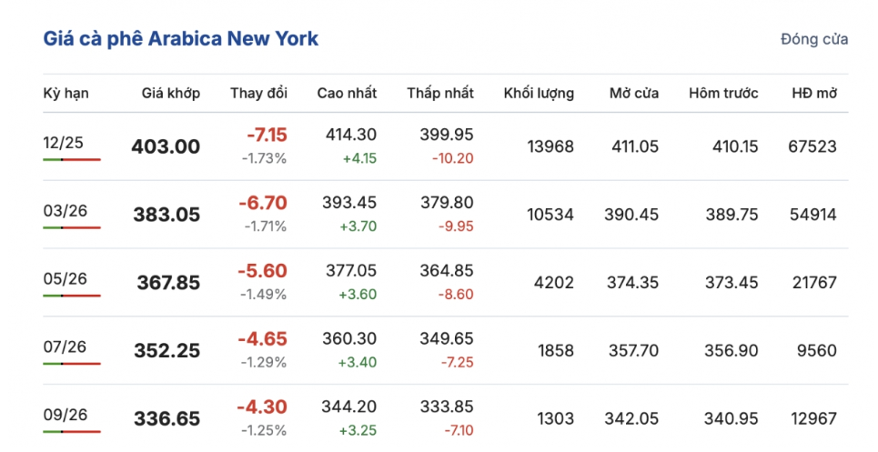Cùng thời điểm này, giá cà phê Arabica trên sàn New York kỳ hạn hợp đồng giao tháng 9/2025 giảm 1,73 %, tương đương giảm 7,15 cent/lb so với chốt phiên liền trước, giá bán đang là 403.01 cent/lb.