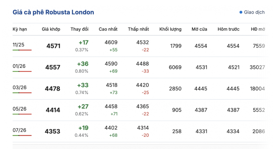 Giá cà phê thế giới sáng nay 26/10 (theo giờ Việt Nam) tăng giảm trái chiều trên 2 sàn giao dịch quốc. Cụ thể, giá cà phê Robusta hợp đồng kỳ hạn giao tháng 9/2025 trên sàn London tăng 0,37%, tương đương tăng 17 USD/tấn so với phiên trước, giá bán đang là 4.571 USD/tấn.