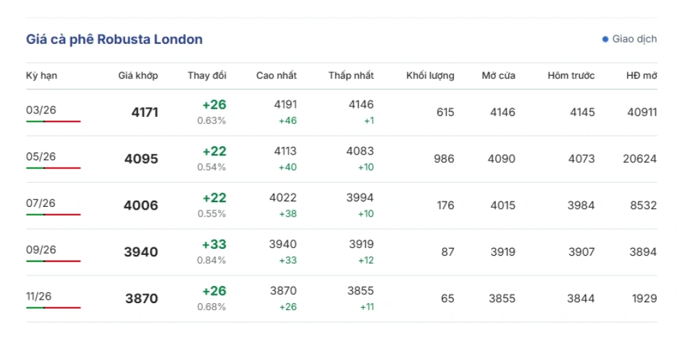 Giá cà phê tại thị trường thế giới tối 29/1 (theo giờ Việt Nam) đảo chiều tăng trở lại trên cả 2 sàn giao dịch quốc tế. So với phiên giao dịch gần nhất, giá cà phê Robusta London dao động ở mức 4.146 – 4.191 USD/tấn. Cụ thể, giá cà phê Robusta hợp đồng kỳ hạn giao tháng 3/2026 trên sàn London tăng 0,63%, tương đương tăng 26 USD/tấn, giao dịch ở mức 4.171 USD/tấn.