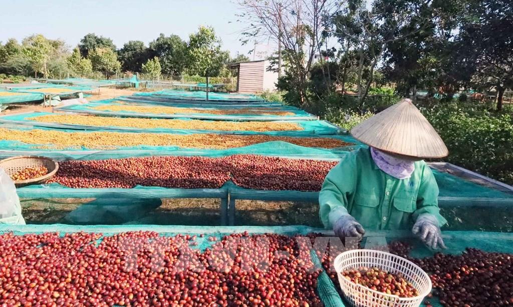 Nông dân trồng cà phê Robusta tại Đắk Lắk đang phơi cà phê sau thu hoạch. Ảnh: Kha Phạm - TTXVN