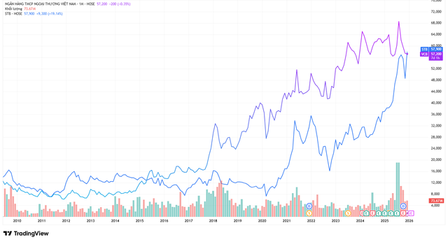 Trong khi STB tăng giá, VCB hôm nay đóng cửa bằng giá tham chiếu 57.200 đồng/cp. Hiện VCB vẫn là cổ phiếu ngân hàng có vốn hóa cao nhất ngành, đạt hơn 477 nghìn tỷ đồng.