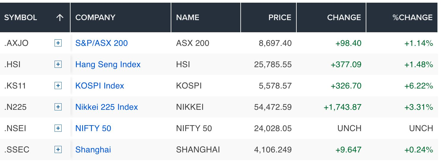Tại châu Á, chỉ số Topix của Nhật Bản tăng 1,3%. Hợp đồng tương lai Hang Seng giao dịch ở 25.370 điểm, thấp hơn mức đóng cửa gần nhất là 25.408,46 điểm, phản ánh tâm lý thận trọng của nhà đầu tư khu vực.