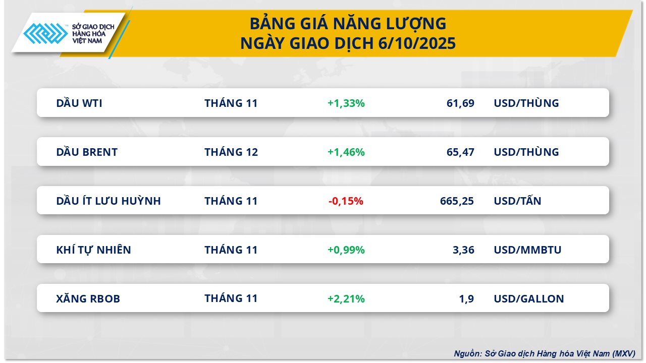 Theo ghi nhận từ Sở Giao dịch Hàng hóa Việt Nam (MXV), sắc xanh đã quay trở lại thị trường năng lượng trong phiên giao dịch ngày hôm qua (6/10). Đặc biệt, giá dầu Brent đã quay trở lại mốc 65,47 USD/thùng, tương ứng với mức tăng 1,46%; trong khi giá dầu WTI cũng ghi nhận mức hồi phục 1,33%, leo lên mốc 61,69 USD/thùng.