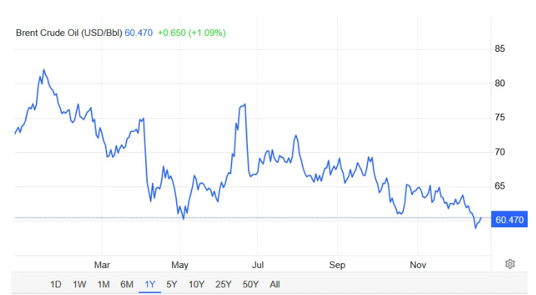 Hồi tháng 11/2025, Ngân hàng Thế giới dự báo giá dầu Brent giảm về bình quân 68 USD trong năm 2025 xuống 60 USD/thùng trong năm 2026. Một bài viết ngày 19/12 của Oil Price còn dự báo giá dầu có thể giảm về dưới 60 USD/thùng vào cuối năm nay.