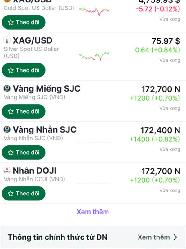 Các loại vàng nhẫn tròn trơn cũng không nằm ngoài xu hướng. Nhẫn tròn ép vỉ Kim Gia Bảo 24K tại đây đang giao dịch quanh mức 169,7 triệu đồng/lượng mua vào và 172,7 triệu đồng/lượng bán ra. Thậm chí, các loại vàng trang sức 24K (999.9) cũng đã chạm ngưỡng 167,7 triệu đồng/lượng mua vào và 171,7 triệu đồng/lượng bán ra.