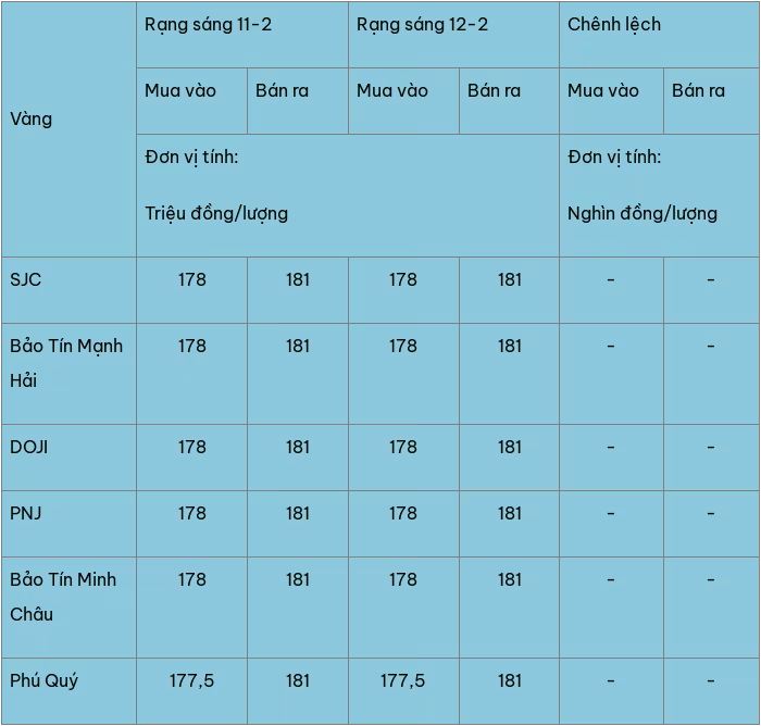 Cụ thể, vàng miếng thương hiệu SJC, PNJ, DOJI, Bảo Tín Mạnh Hải và Bảo Tín Minh Châu mua vào 178 triệu đồng/lượng; bán ra 181 triệu đồng/lượng, ổn định ở cả hai chiều so với sáng qua.