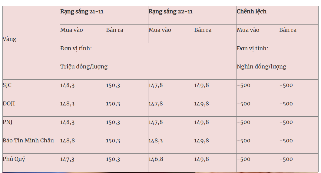 Giá vàng miếng trong nước cập nhật sáng 22-11 như sau: