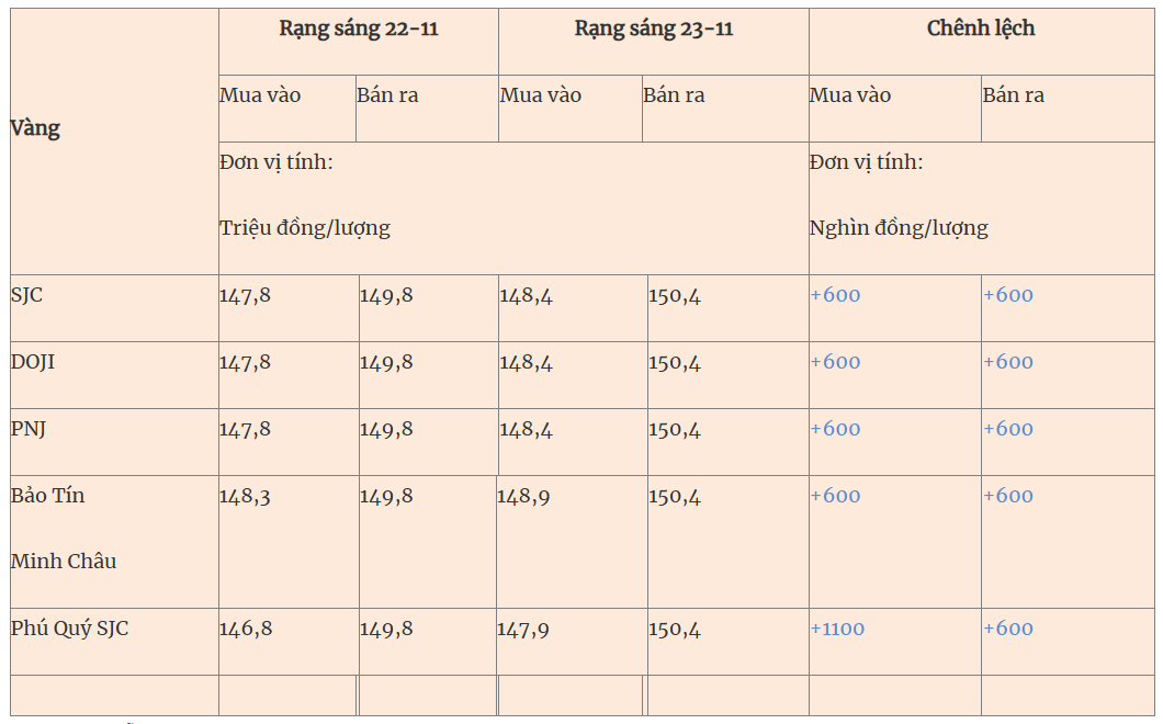 Giá vàng miếng trong nước cập nhật sáng 23-11 như sau: