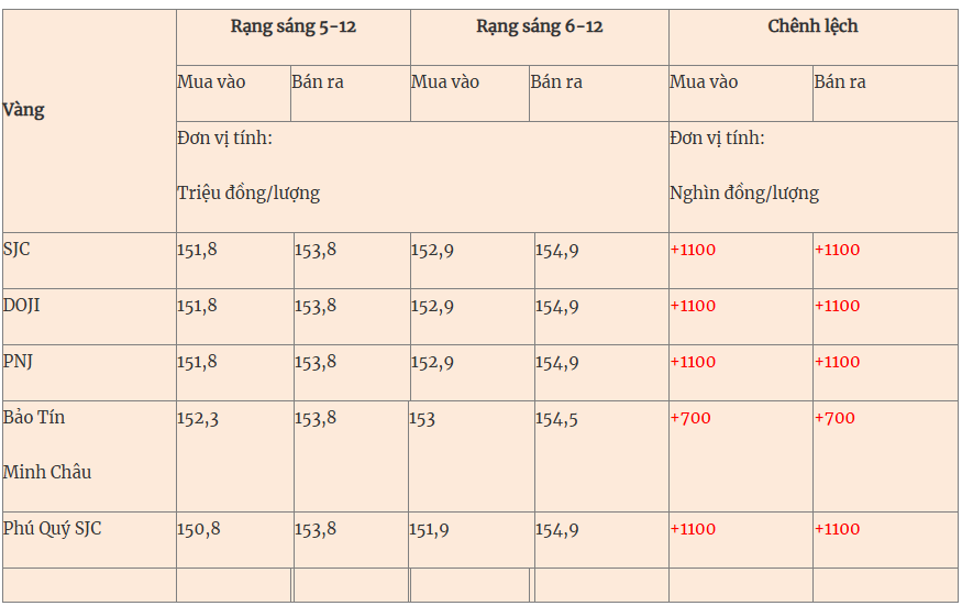 Giá vàng miếng trong nước cập nhật sáng 6-12 như sau: