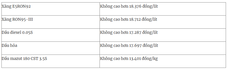 Theo đó, xăng E5RON92 tăng 143 đồng/lít; xăng RON95 tăng 152 đồng/lít; dầu diesel tăng 226 đồng/lít; dầu hỏa tăng 138 đồng/lít ; dầu mazut giảm 2 đồng/kg.