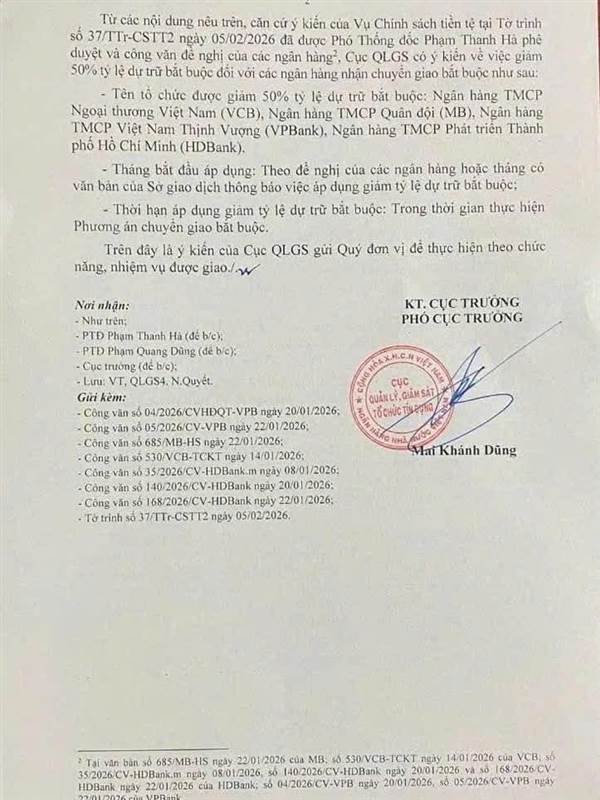 Ngày 10/2, Cục Quản lý, giám sát tổ chức tín dụng - Ngân hàng Nhà nước ban hành văn bản hướng dẫn thực hiện quyền giảm 50% tỷ lệ dự trữ bắt buộc đối với các tổ chức tín dụng nhận chuyển giao bắt buộc. Quyết định này ngay lập tức tạo ra cú hích lớn về thanh khoản và lợi nhuận cho 4 "ông lớn" gồm Vietcombank, MB, VPBank và HDBank.