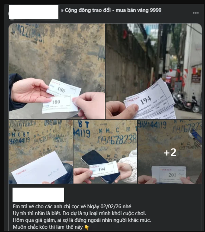 Không chỉ vàng, bạc mà ngay cả giấy hẹn, phiếu xếp hàng mua vàng cũng trở thành mặt hàng được “săn đón”. Trên các hội nhóm chuyên mua bán vàng, nhiều tài khoản đăng tải thông tin bán lại số thứ tự mua vàng, bạc với mức giá dao động từ 200.000 đồng đến 1 triệu đồng mỗi số.