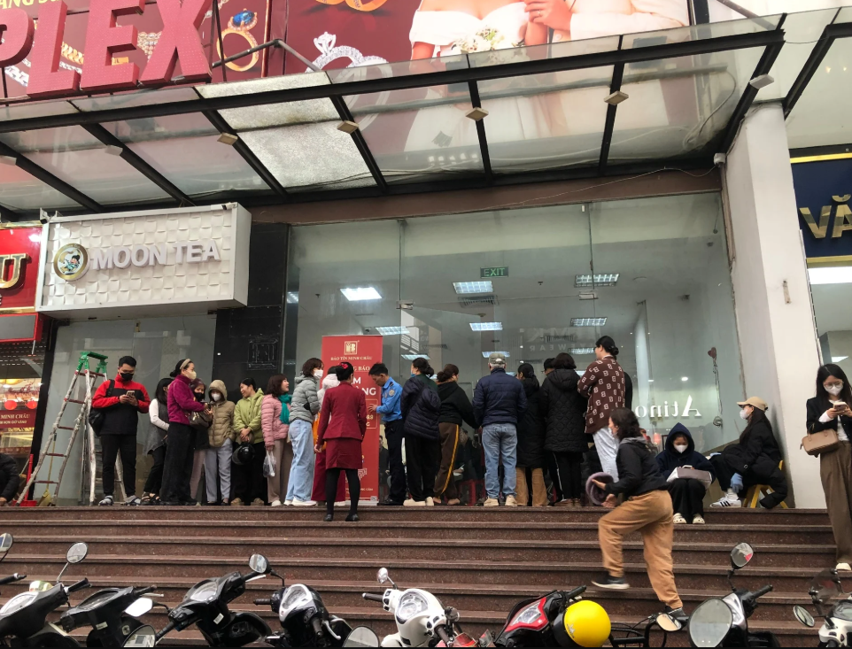 Tại một cửa hàng của Bảo Tín Minh Châu trên đường Cầu Giấy (Hà Nội), mới hơn 7h sáng, nhân viên cửa hàng đã thông báo nhận đủ 200 khách và dừng giao dịch trong buổi sáng 4/2. Tuy nhiên, bên ngoài cửa hàng vẫn có rất đông người tiếp tục đứng chờ, hy vọng có thêm suất mua vàng.