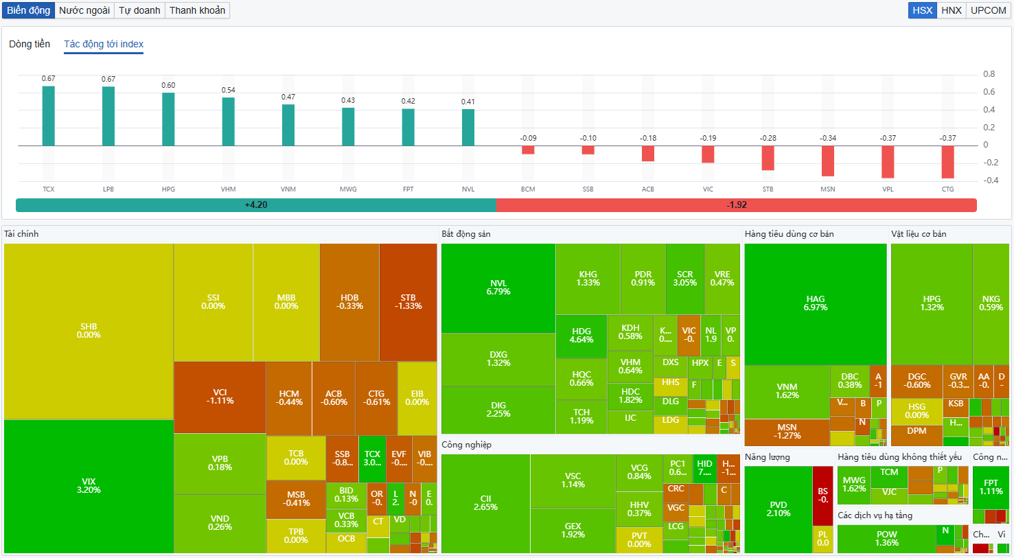 Phiên chiều ghi nhận diễn biến giằng co nhưng lực cầu tăng dần về cuối phiên giúp VN-Index giữ vững sắc xanh. TCX, LPB, HPG và VHM là những cổ phiếu đóng góp tích cực nhất cho chỉ số. Ngược lại, CTG, VPL, MSN và STB vẫn chịu áp lực bán.