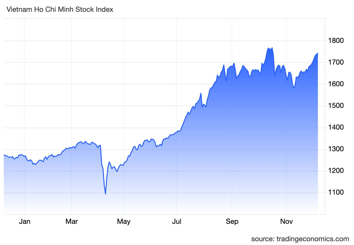 Thị trường chứng khoán có tuần giao dịch đầu tháng 1-5/12 với mức tăng hơn 50 điểm tính từ mốc kết tuần trước. Nhóm vốn hóa lớn tiếp tục là điểm nhấn nâng đỡ chỉ số chinh phục lại các vùng kháng cự cũ với tiêu điểm là "họ" Vingroup, bên cạnh đó còn có sự hỗ trợ ở nhóm ngân hàng, bán lẻ. Về giá trị giao dịch của khối ngoại, nhóm nhà đầu tư này bất ngờ trở lại mua ròng trong tuần này sau chuỗi hàng tháng liên tục xả hàng. Trong đó, 3 phiên giữa tuần lực mua mạnh trước khi quay đầu bán ròng vào ngày cuối tuần.