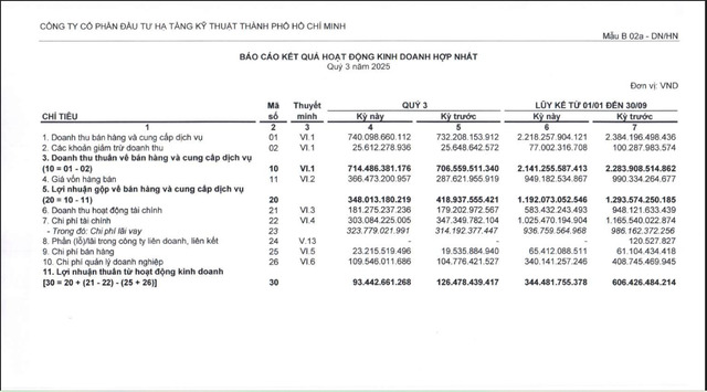 Về tình hình kinh doanh, theo báo cáo tài chính hợp nhất quýIII/2025, CII ghi nhận doanh thu thuần đạt 714,5 tỷ đồng, nhích nhẹ so với mức706,6 tỷ đồng của cùng kỳ. Sau khi trừ giá vốn, lợi nhuận gộp đạt 348 tỷ đồng.