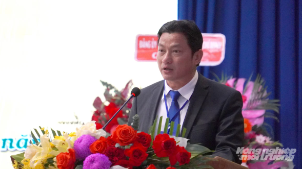 Ông Nguyễn Đức Hiền, Tổng Giám đốc Công ty Cao su Dầu Tiếng báo cáo tổng kết tình hình công ty năm 2025. Ảnh: Lê Bình.