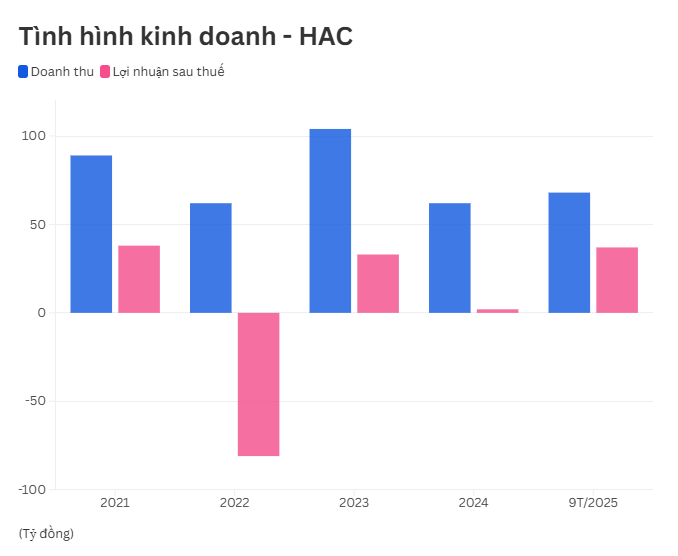 Theo BCTC quý III/2025, trong kỳ này HAC ghi nhận doanh thu hơn 9,2 tỷ đồng, giảm gần một nửa so với cùng kỳ năm trước. Trong khi đó, lợi nhuận sau thuế âm hơn 5,7 tỷ đồng, tăng mạnh so với mức lỗ hơn 1 tỷ đồng ở cùng kỳ năm 2024.